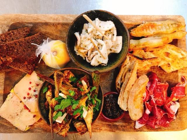 Supions frais poêlés en persillade, tentacules de poulpe grillé sauce vierge ,artichauts frits à la menthe, beignets de fleur de courgette, jambon « Pata Negra Iberico Bellota », pan con tomate, ail