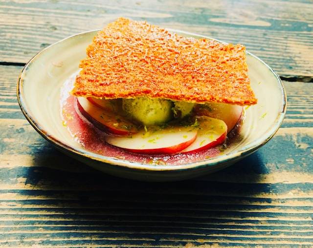 > Gaspacho de pêche, glace pistache, estragon et tuile amandes