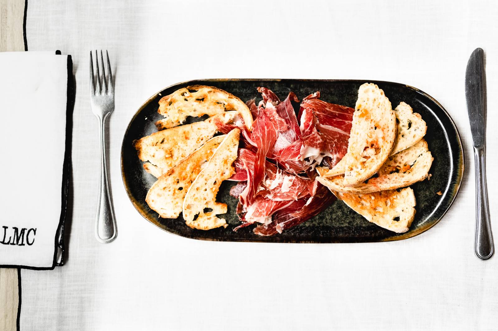 Pata Negra Iberico Bellota petite assiette 80g ou grande assiette 160g 48 mois d’affinage, pan con tomate, ail
