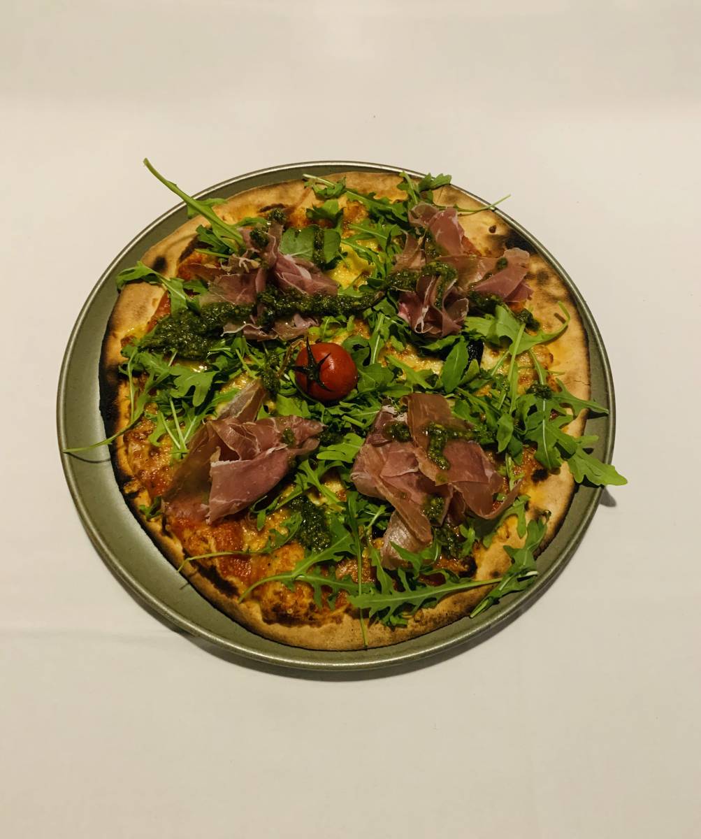 sauce tomate, de mozzarella, de jambon cru, de roquette, de pesto et d'olives noires, ce plat régalera petits et grands.
