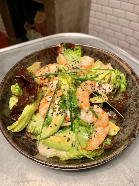 Salade Ponzu, gambas, avocat, sucrine