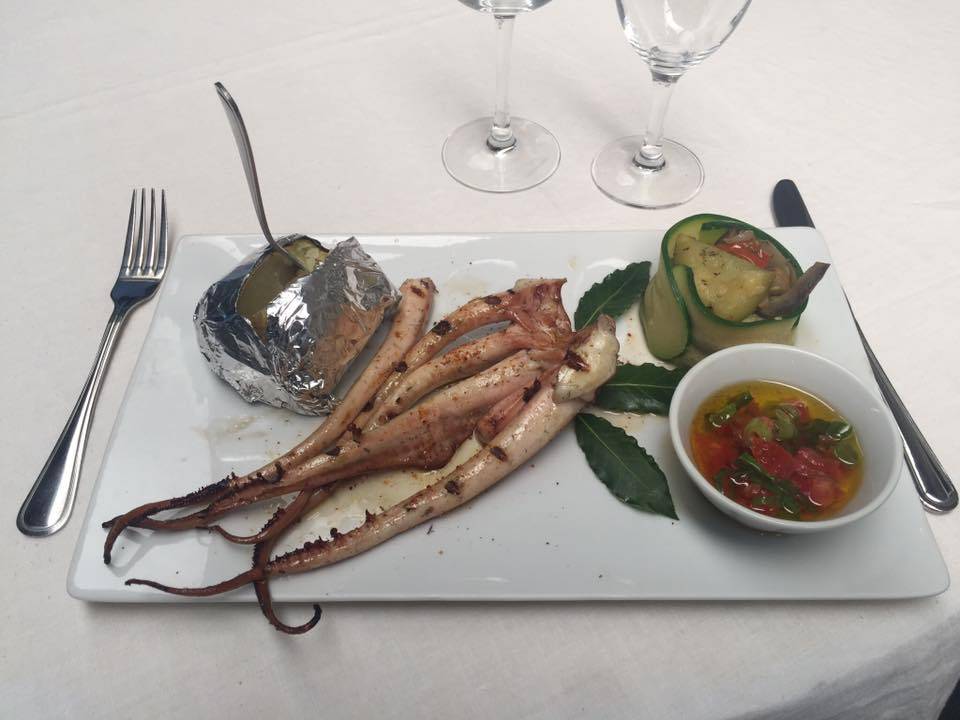 Tentacules de poulpe grillées au feu de bois , pomme de terre en papillote légumes et sauce vierge